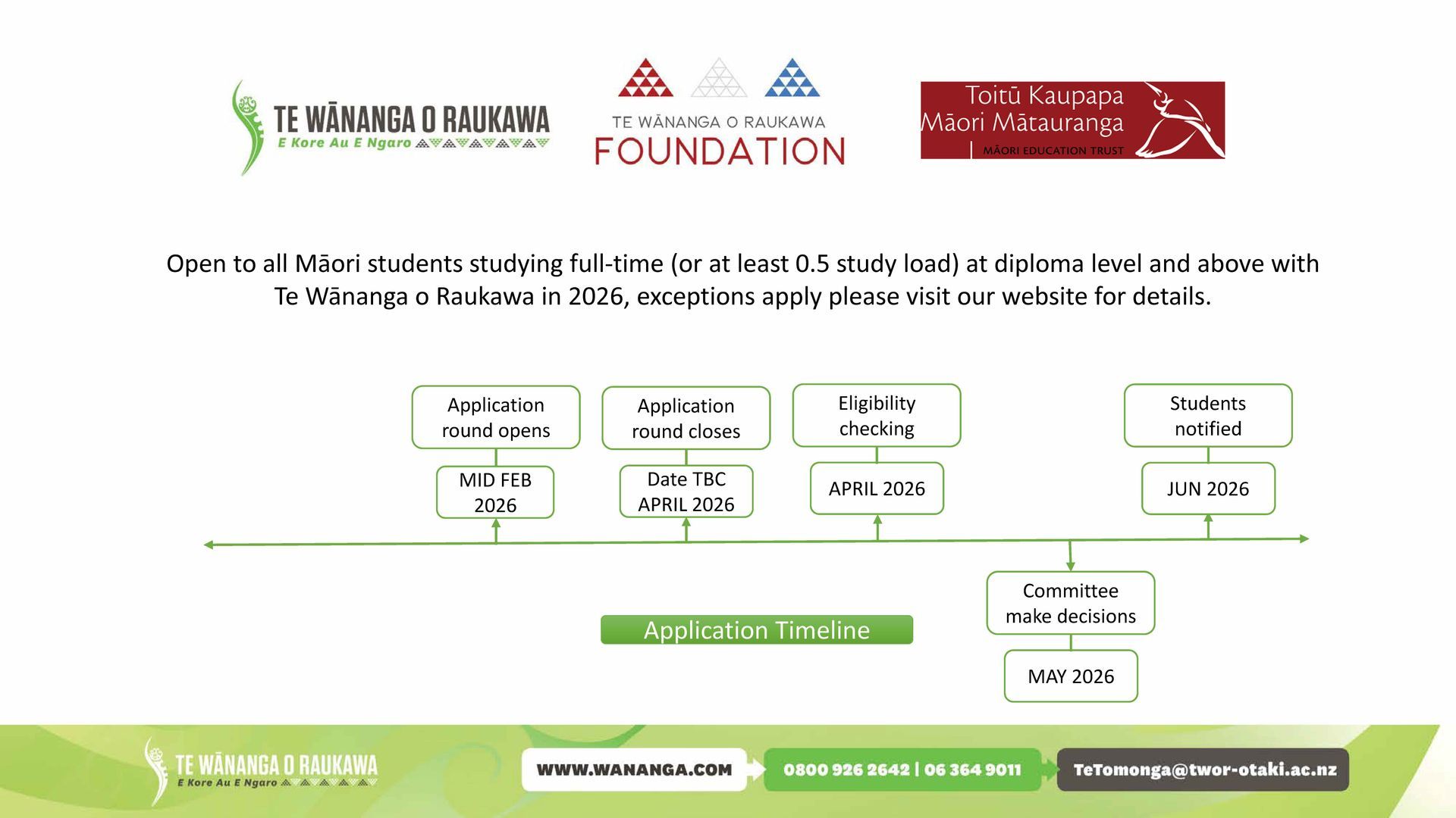 For any queries about scholarship payments please contact Donna-Marie Overend by emailing studentfees@twor-otaki.ac.nz.